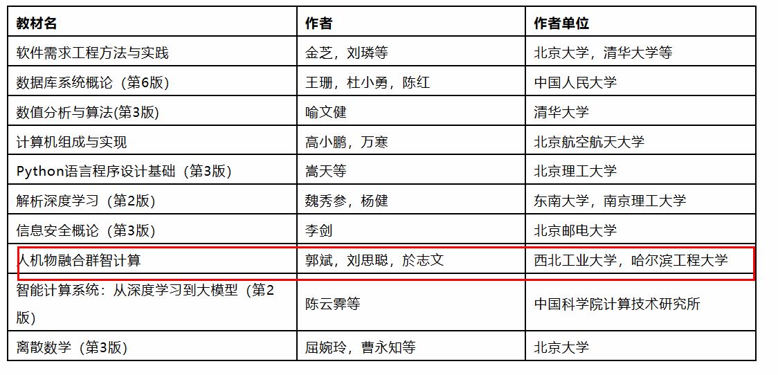 近日,2025年度CCF(中国计算机学会)推荐教材名单正式公布,由今年会官网人机物融合智能计算团队郭斌教授、於志文教授、刘思聪副教授联合编著的《人机物融合群智计算》成功入选,成为计算机领域前沿教学成果的代表之一。