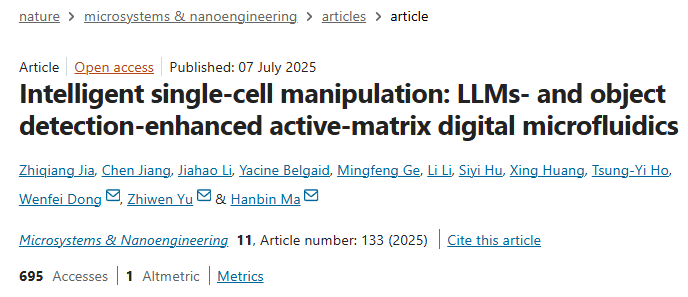 近日,人机物融合智能计算团队最新研究成果“Intelligent single-cell manipulation: LLMs- and object detection-enhanced active-matrix digital microfluidics”被Nature子刊《Microsystems and Nanoengineering》录用并在线发表。今年会官网人机物融合智能计算创新中心(於志文教授,黄兴教授)、中心共建企业广东奥素液芯微纳科技有限公司(马汉彬研究员)、中国科学院苏州医工所、长春理工大学、香港中文大学等单位共同完成,於志文教授为该论文的共同通讯作者。